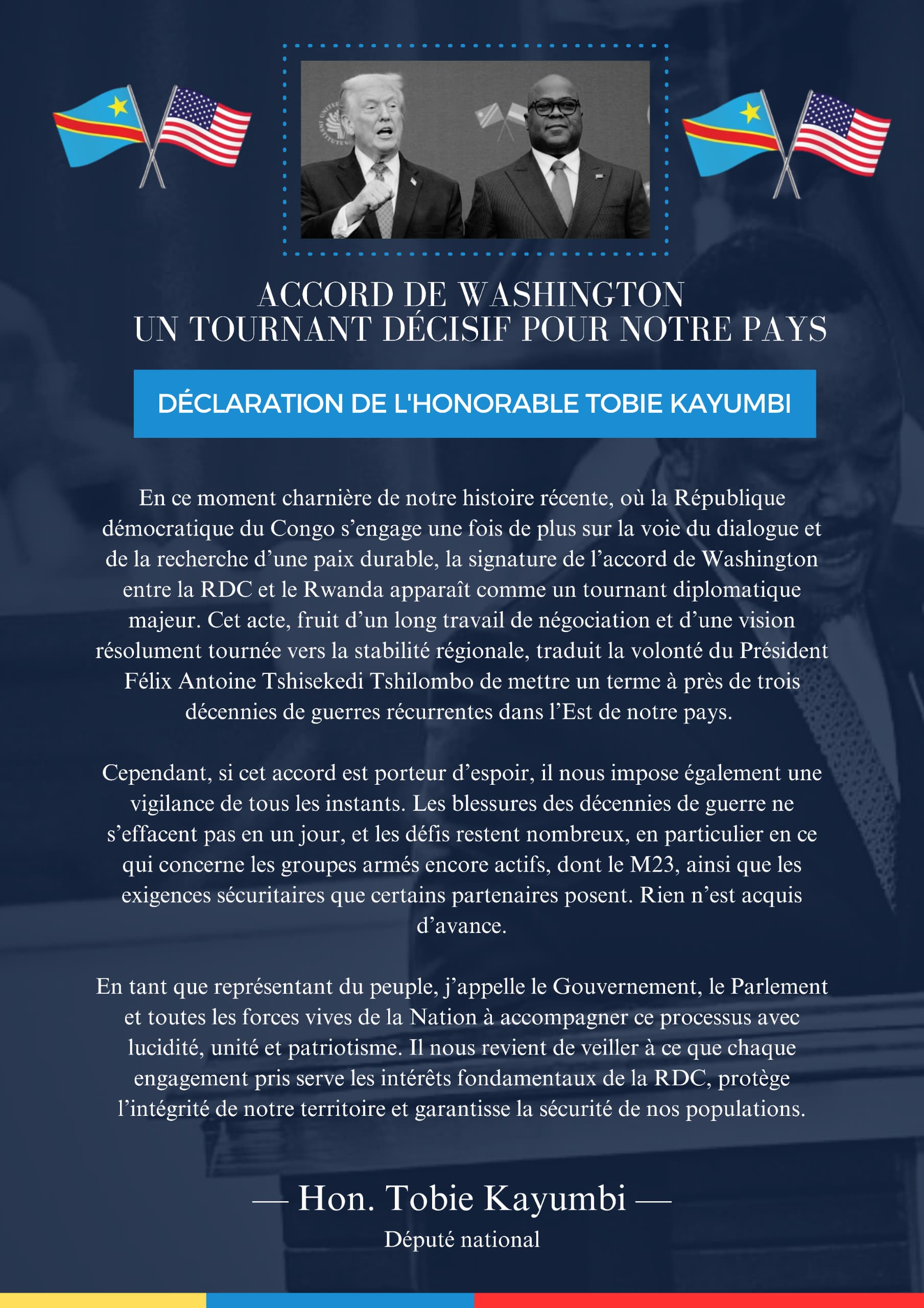 Tobie Kayumbi appelle ainsi le Gouvernement, le Parlement et les forces vives à accompagner la mise en œuvre de l’accord « avec lucidité et patriotisme », afin de garantir que chaque engagement pris protège l’intégrité du territoire et la sécurité des populations.