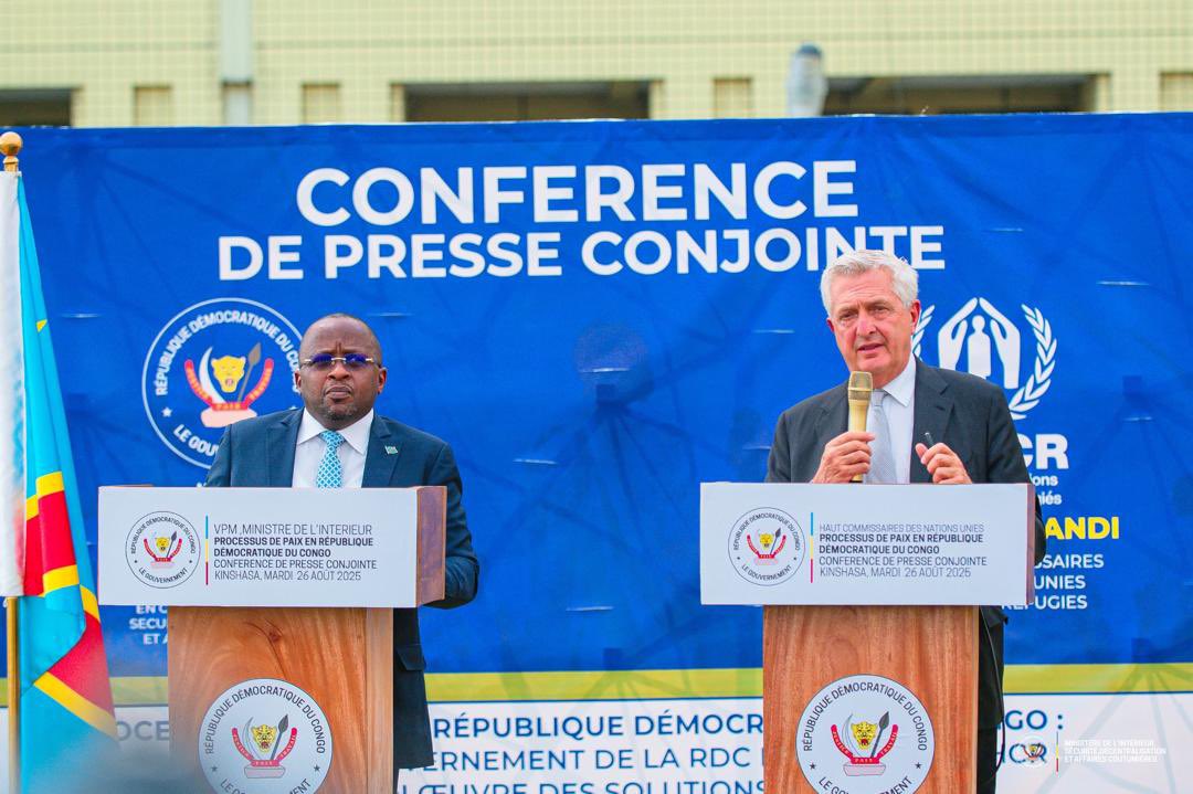 Une conférence de presse conjointe s’est tenue ce mardi 26 août 2025 à Kinshasa, réunissant le Vice-Premier Ministre, Ministre de l’Intérieur, Sécurité, Décentralisation et Affaires Coutumières, Jacquemain SHABANI LUKOO BIHANGO, et le Haut-Commissaire des Nations Unies pour les Réfugiés (HCR), Filippo GRANDI. Cette rencontre, axée sur le processus de paix en République Démocratique du Congo, a mis en lumière la mise en œuvre de solutions durables pour les populations déplacées.